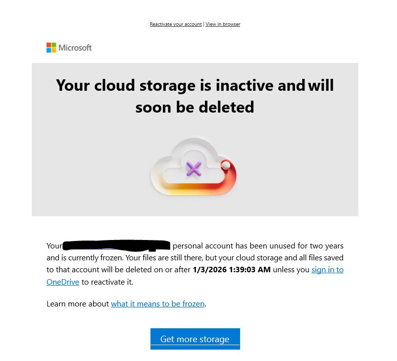 “Your cloud storage is inactive and will soon be deleted.”