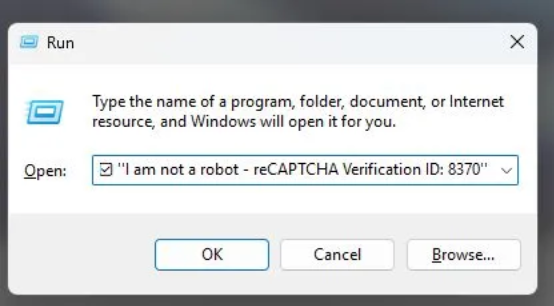 Legitimate CAPTCHA will never ask you to copy and paste commands, and if you do, you’ll be executing a harmful command that could compromise your machine’s security. The fake CAPTCHA wants to appear legitimate by showing you a preview of the command that you are being instructed to copy and paste, but this is a ruse. The real command being executed is obfuscated and is actually malicious, and may be hidden from view outside of the text field (as seen in the Run dialog box, where the command appears to be a harmless verification ID).